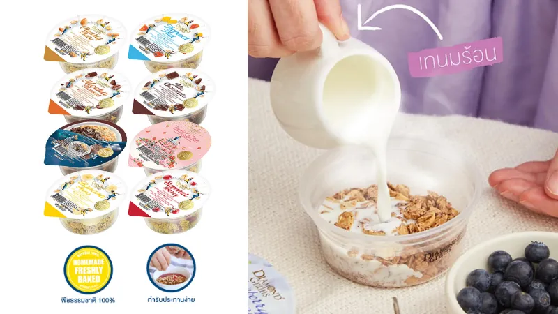 อีกแบรนด์ไทยที่เข้าใจผู้บริโภคไม่แพ้กันคือ Diamond Grains จากเดิมที่กราโนล่าเป็นขนมสุขภาพที่ต้องเทใส่ถ้วยเอง Diamond Grains กลับพลิกภาพให้สะดวกขึ้นด้วย ถ้วยพร้อมทาน