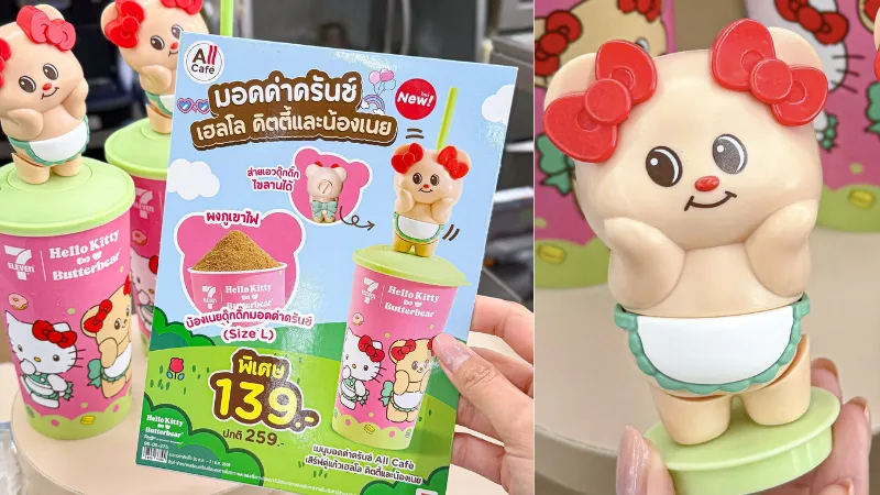 ถึงแม้ว่าตัวอย่างนี้จะอยู่ในกลุ่มเครื่องดื่ม แต่เราสามารถนำไปคิดต่อยอดได้ โดยไอเดียนี้มาจาก แก้วสะสม Hello Kitty x Butterbear จาก 7-Eleven ดีไซน์แก้วสีพาสเทลสดใส พร้อมฝาที่มีมาสคอตตัวการ์ตูนน่ารัก ทำให้กลายเป็น ของสะสม มากกว่าแค่แก้วน้ำ